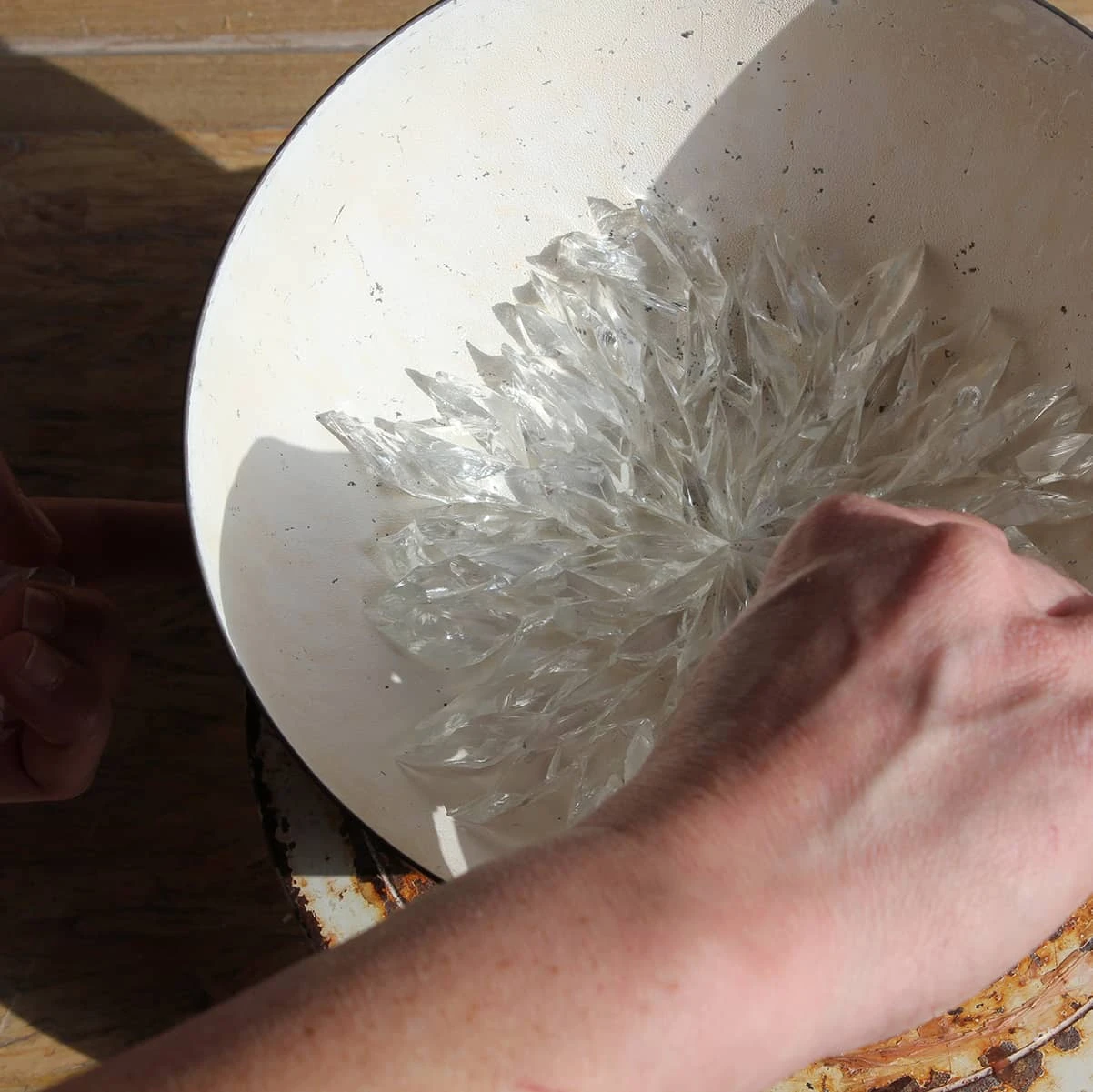 L’artiste a choisi d’appliquer le principe de « détruire et créer, détruire pour créer », prendre une plaque de verre, la casser au burin pour créer des multiples de pétales qu’ensuite elle réassemble par thermocollage pour composer un motif floral symbole de printemps, de renouveau et d’épanouissement.