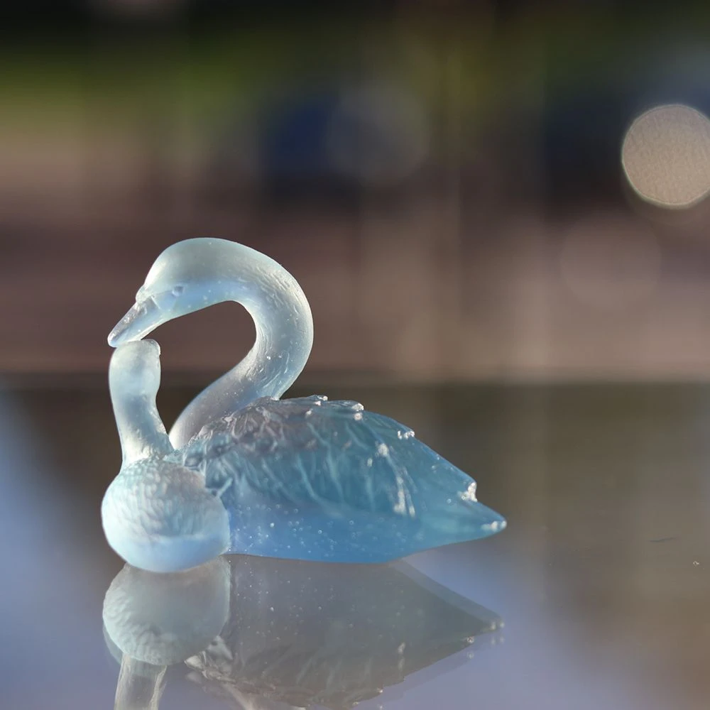 Sculpture artistique représentant un symbole fort : l’amour de deux animaux, le couple de cygnes existe en deux couleurs : bleu et rose.