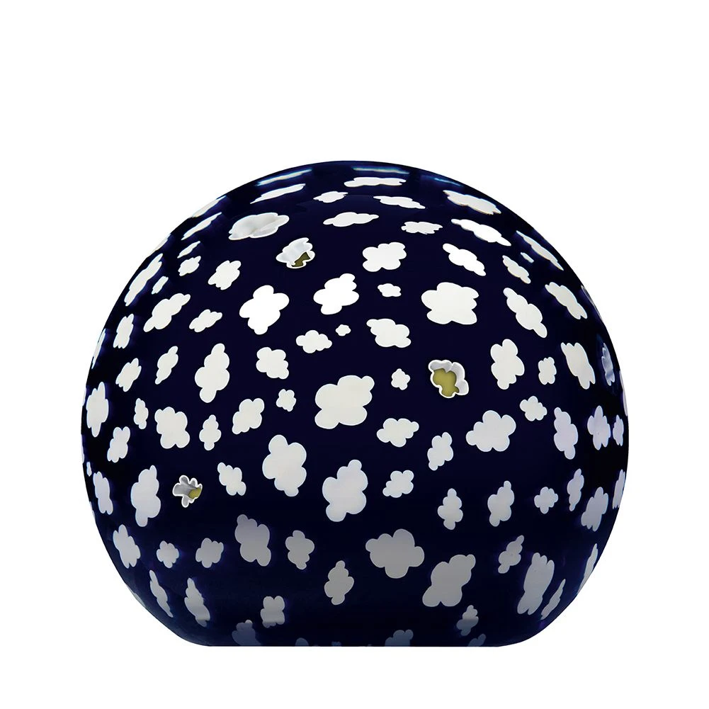 Regarder le ciel à travers une boule de cristal, telle est la promesse de Nuages. Suivant les règles ancestrales du millefiori, des baguettes ont été exclusivement réalisées, découpées puis agencées afin de reproduire le ciel parsemé de nuages. Certains apparaissent plus sombres, alors que d’autres, plus clairs, laissent filtrer les rayons du soleil naissant sous une calotte de cristal.