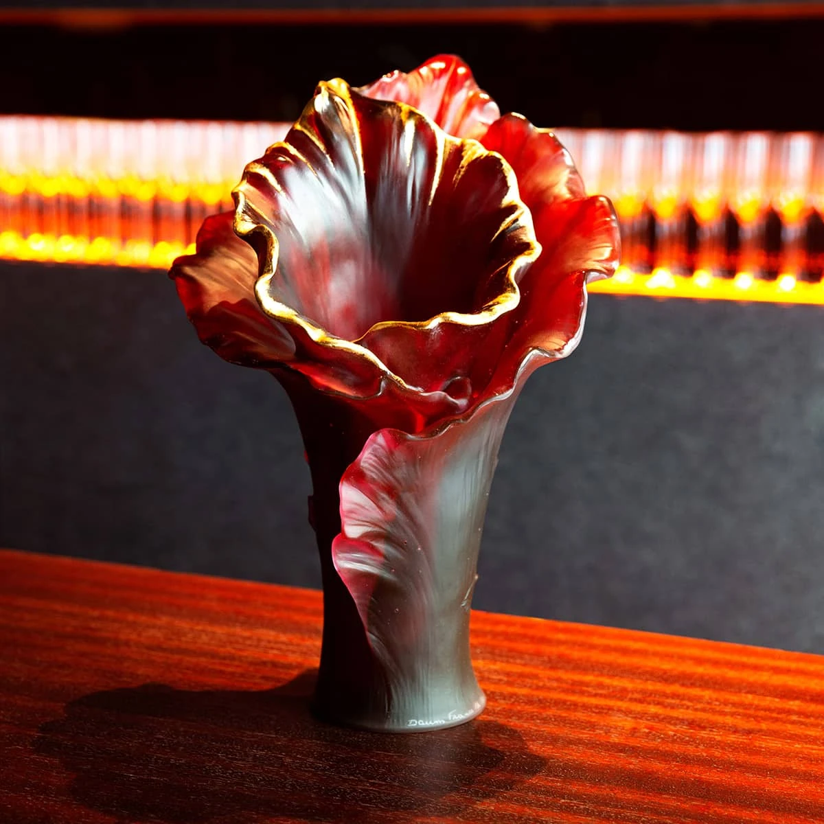 Les détails de la sculpture de cette fleur délicate reflètent le talent des maîtres verrier de la cristallerie Daum. Plus de 300 heures de travail ont été nécessaires pour la naissance de cette pièce en cristal, dont chaque reproduction reste pas moins de 2 semaines dans les fours afin que le vase prenne cette magnifique teinte de rouge rubis.