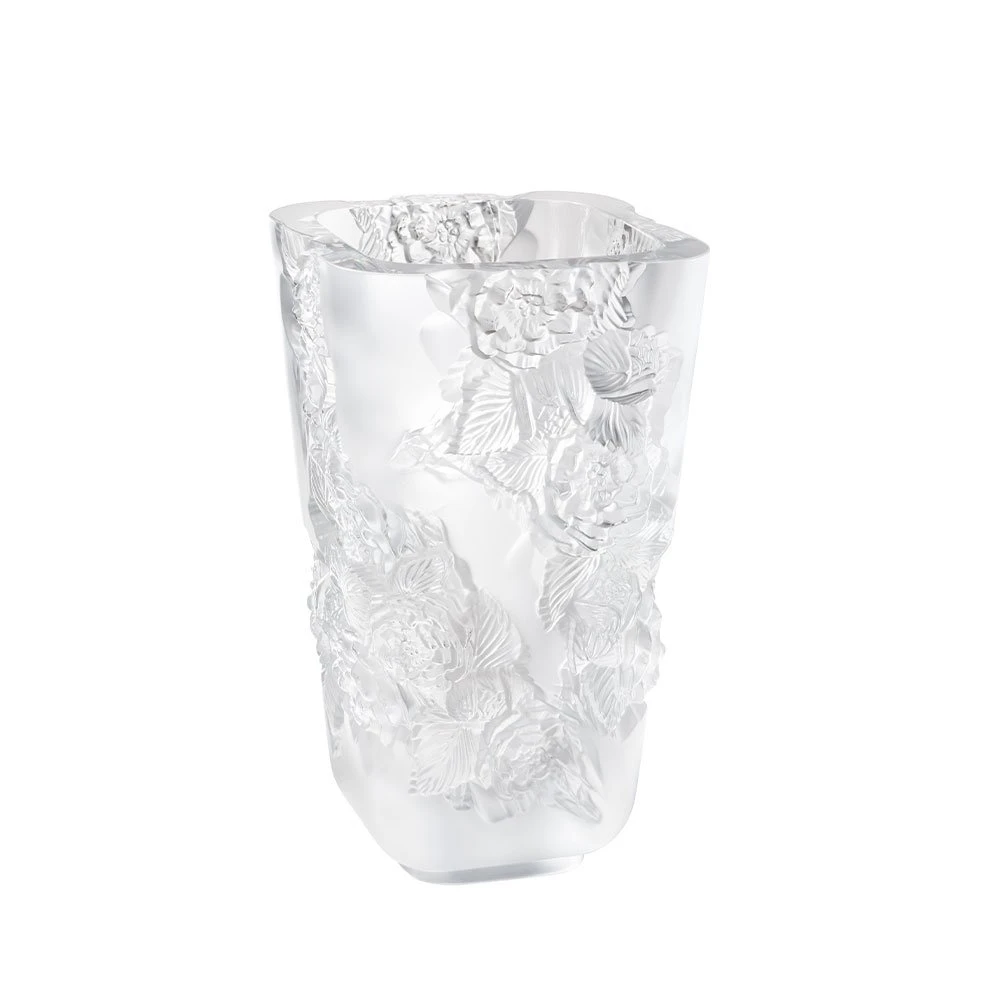 Le vase Pivoine est la parfaite illustration du constate entre la douceur florale et la puissance minérale. Mélange de formes carrées et de lignes courbes, la technique utilisée est celle du pressé. Le verrier doit être vigilant à l’impression de l’opulent décor floral. Le volume de la pièce rend la manipulation complexe, chaque pièce étant portée à bout de bras.
